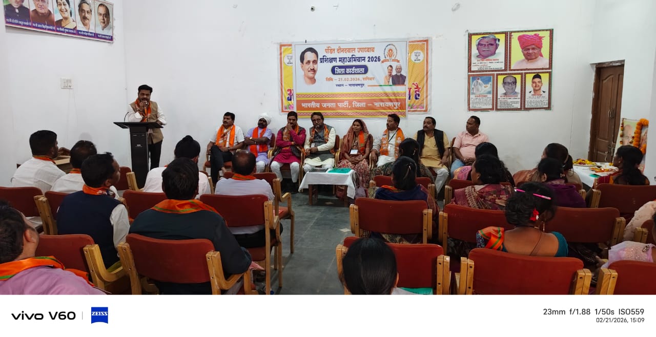 नारायणपुर: भारतीय जनता पार्टी (भाजपा) के जिला कार्यालय में ‘पंडित दीनदयाल उपाध्याय प्रशिक्षण महाभियान-2026’ के तहत जिला स्तरीय कार्यशाला का आयोजन किया गया। कार्यशाला में पार्टी पदाधिकारियों ने प्रशिक्षण को संगठन की मजबूती का आधार बताया और कहा कि प्रशिक्षित कार्यकर्ता ही संगठन की वास्तविक शक्ति होते हैं।