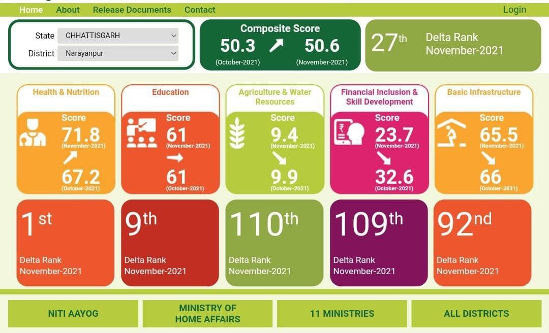 उल्लेखनीय है कि 5 वर्गों के विभिन्न मानक बिन्दुओं पर नीति आयोग ने देश के 112 जिलों की रैंकिंग जारी की है। नीति आयोग द्वारा विकास के विभिन्न मापदण्डों के आधार पर देश के सर्वाधिक सुधार वाले आकांक्षी जिलों की माह नवम्बर 2021 की डेल्टा रैंकिंग में नारायणपुर जिला देश में 27 वां स्थान हासिल किया। देश के आंकाक्षी जिलों में सामाजिक विकास के विभिन्न क्षेत्रों में दर्ज की गई प्रगति के आधार पर नीति आयोग द्वारा रैंकिंग की गई है।