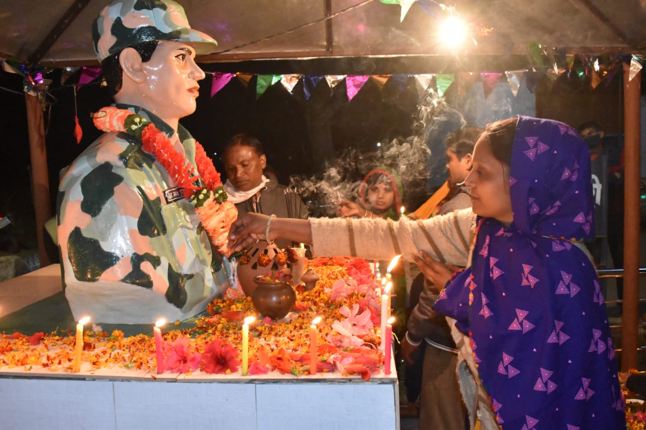 शहीद श्री देवनाथ पुजारी के स्टेच्यू में माल्यार्पण कर जलाया गया मोमबत्ती