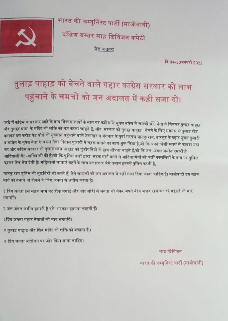 नक्सलियो के माड़ डिवीजन ने जारी किया पर्चा । तुलार पहाड़ को बेचने के नाम पर तीन लोगों को जनअदालत में सजा देने की बात है लिखी ।