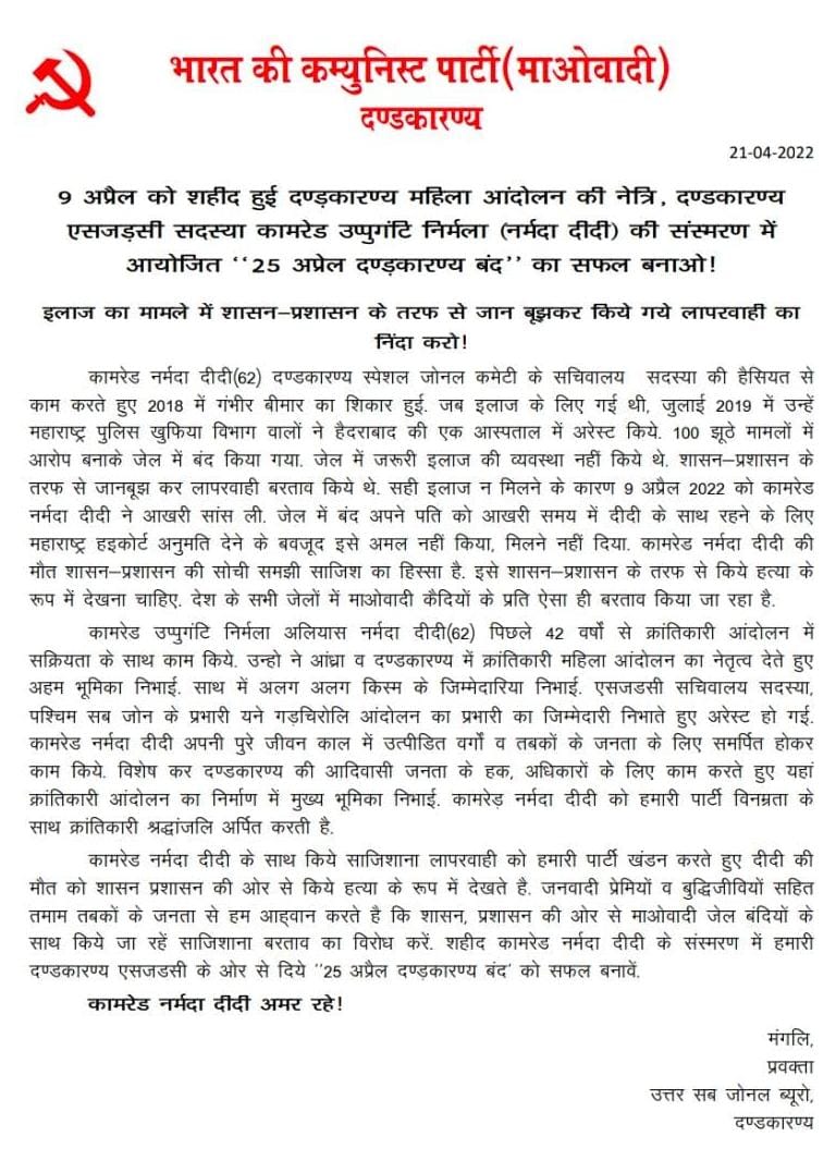 SZC सदस्य नक्सली नेता नर्मदाक्का की मौत का जिम्मेदार शासन प्रशासन को ठहराया,