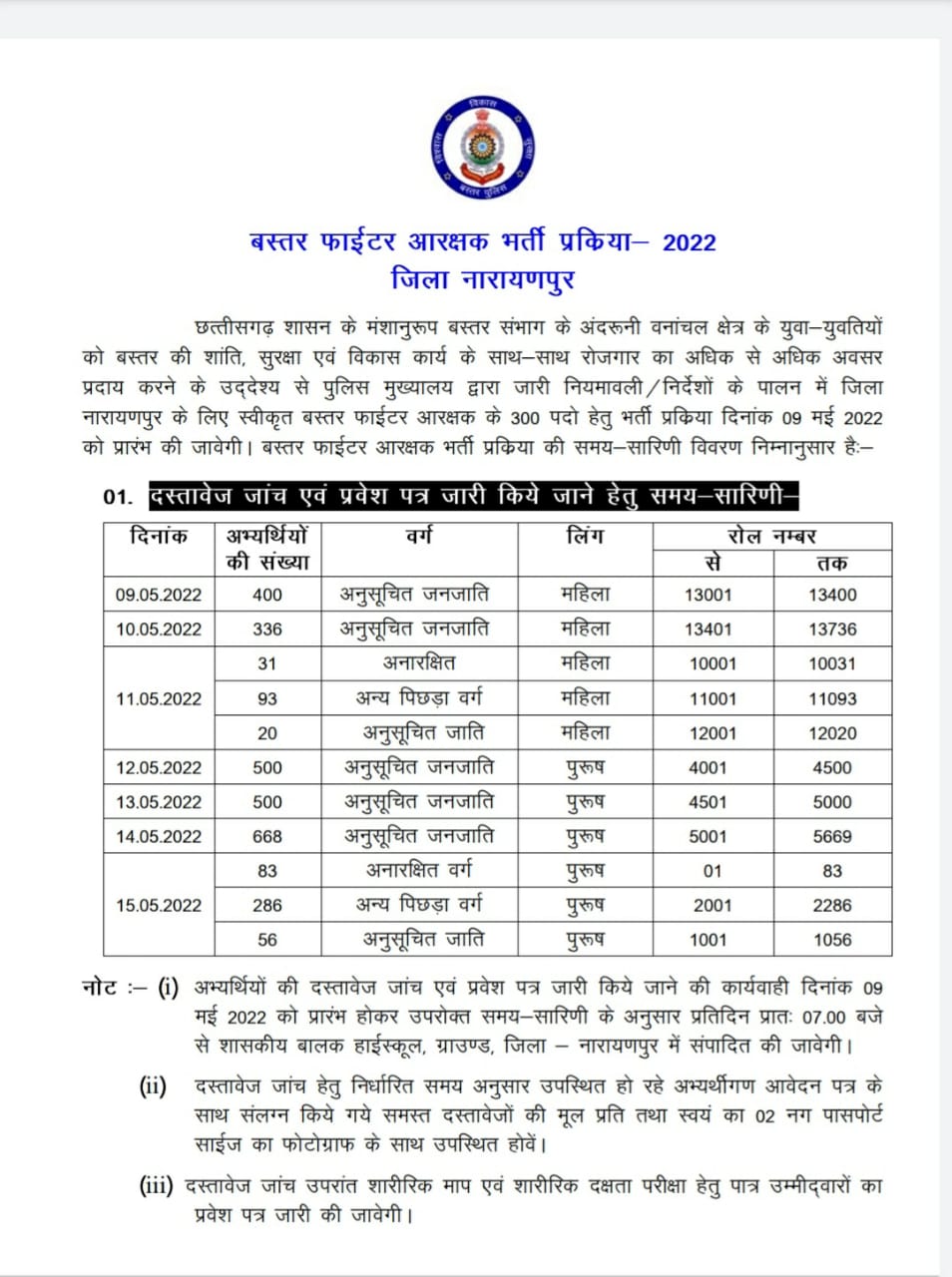 नोट :-* (i) अभ्यर्थियों की दस्तावेज जांच एवं प्रवेश पत्र जारी किये जाने की कार्यवाही दिनांक 09 मई 2022 को प्रारंभ होकर उपरोक्त समय-सारिणी के अनुसार प्रतिदिन प्रातः 07.00 बजे से शासकीय बालक हाईस्कूल ग्राउण्ड, जिला नारायणपुर में संपादित की जावेगी।