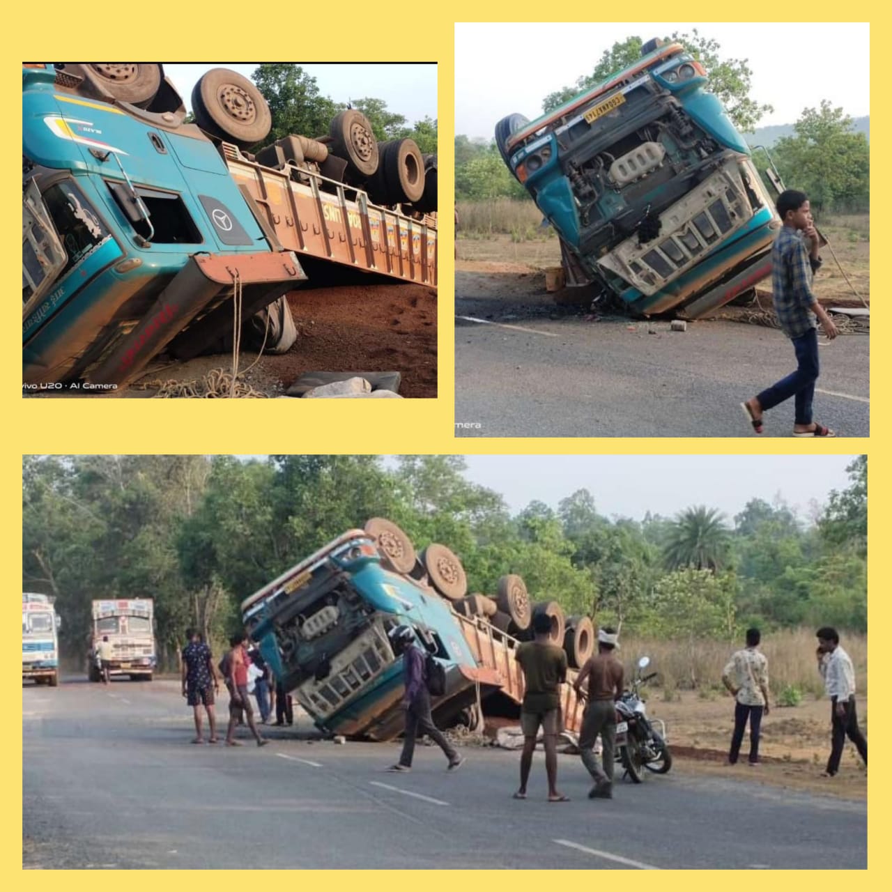 लौह अयस्क से भरा हुआ ट्रक पलटा चक्के हो गए ऊपर, कोई गंभीर नहीं