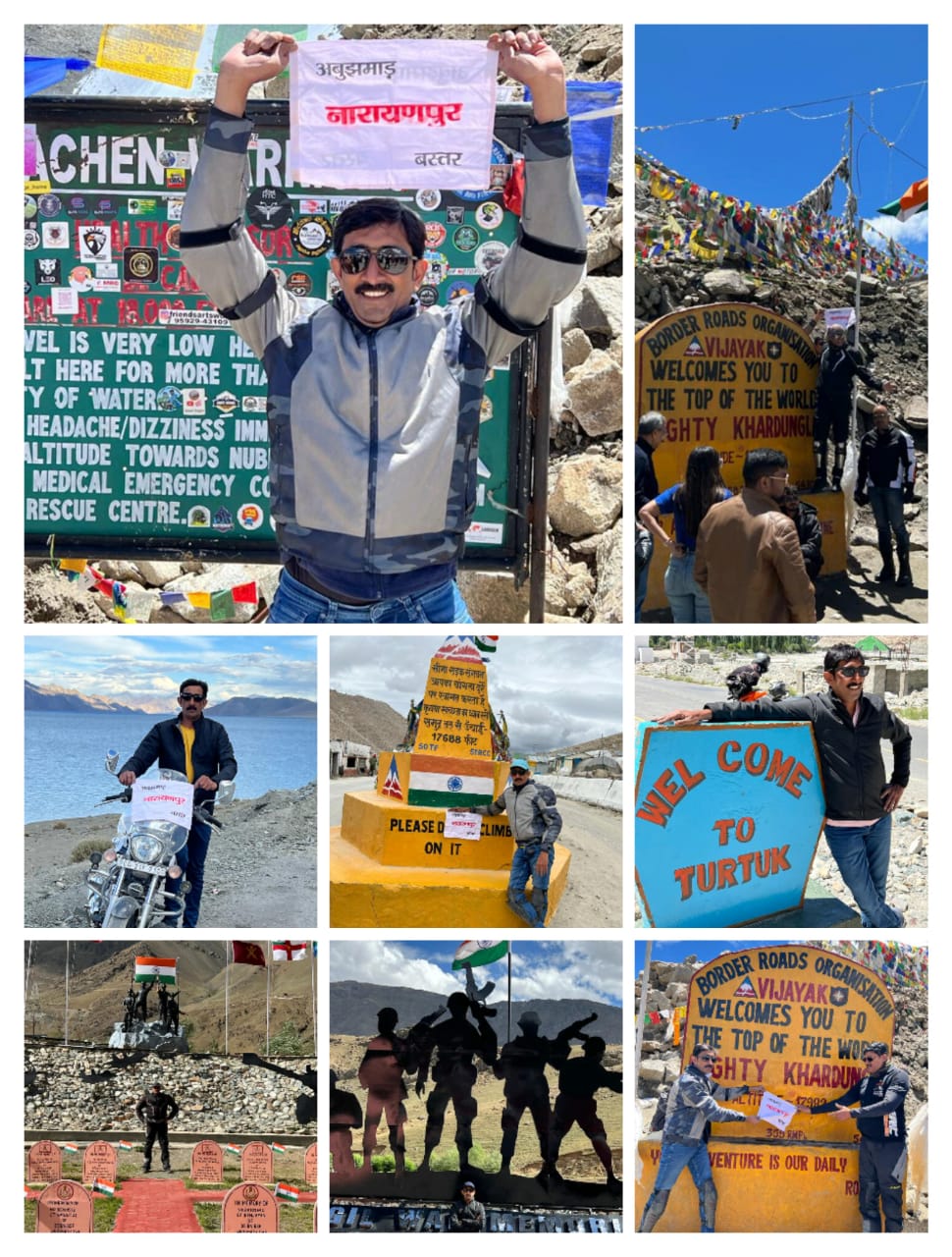 नक्सल प्रभावित नारायणपुर जिले में भी अब बाइक राइडिंग का जुनून देखने को मिल रहा है ,नारायणपुर निवाशी राकेश जैन ने 4000 किलोमीटर का सफर एवेंजर बाइक राइड कर नारायणपुर जिले से 9 राज्यों को पार कर लेह लद्दाख तक का सफर पूरा किया ,राकेश जैन जो पेशे से व्यापारी है लेकिन व्यापार के साथ साथ बाइक राइडिंग का शौख उन्हें लेह लद्दाख तक पहुचा जेएगा उन्होंने सोचा ही नही था ,दरअसल कुछ दिनों पहले की बात है जब रायपुर से छत्तीसगढ़ इनफिनिटी बाइक राइडरों का दल राइडिंग करते हुए नारायणपुर पहुचा था वही दल के कैप्टन थे सुनील शर्मा जो भिलाई के रहने वाले है 50 वर्ष से अधिक उम्र होने के बाउजूद वे हजारो किलोमिटर का सफर आसानी से कर लेते है ,राइडरों का दल जब नारायणपुर पहुचा तब उन से मिलकर राकेश जैन की मंशा लम्बी राइडिंग को लेकर बनी फिर क्या था उन्होंने भी ठान लिया एक लंबी राइडिंग का और निकल चले लम्बी यात्रा के लिए वो भी अपने एवेंजर बाइक से और साथी बने सुनील शर्मा जिन्हें बाइक राइडिंग का लंबा अनुभव प्राप्त है ,सुनील शर्मा शर्मा हर साल हजारों किलोमीटर की राइडिंग देश कर अलग अलग हिस्सों में करते है ,लेकिन राकेश जैन के लिए ये अनुभव तो नया था लेह लद्दाख के कठिनाई भरे रास्तो में चलना आसान बिल्कुल नही है ,फिर भी पहुच गए लेह लद्दाख और अबूझमाड़ का झंडा फैरा कर राकेश जैन और सुनील शर्मा ने मनाया देश की आजादी का अमृत महोत्सव ।