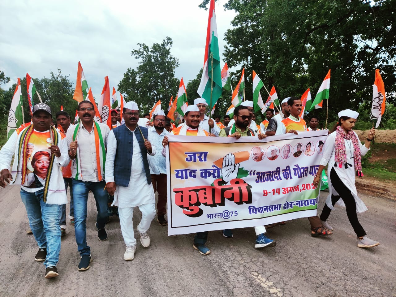नारायणपुर- भारतीय राष्ट्रीय कांग्रेस के आह्वान पर प्रदेश कांग्रेस कमेटी के निर्देशानुसार भारत की आजादी के 75 वें वर्षगांठ पर नारायणपुर विधानसभा स्तरीय पद यात्रा “आजादी की गौरव यात्रा “का शुभारंभ नारायणपुर विधानसभा के छोटेडोंगर ब्लॉक के छोटेडोंगर से शुभारंभ किया गया। “आजादी के गौरव यात्रा” विधानसभा स्तरीय पदयात्रा में नारायणपुर जिला कांग्रेस कमेटी के अध्यक्ष देवनाथ उसेण्डी एवं प्रदेश कांग्रेस महामंत्री रजनु नेताम सहित सैकड़ों कार्यकर्ताओं की उपस्थिति में कांग्रेस जनों ने छोटेडोंगर,मुंडाटिकरा,बडगांव,तारागांव,धौडाई मे पदयात्रा