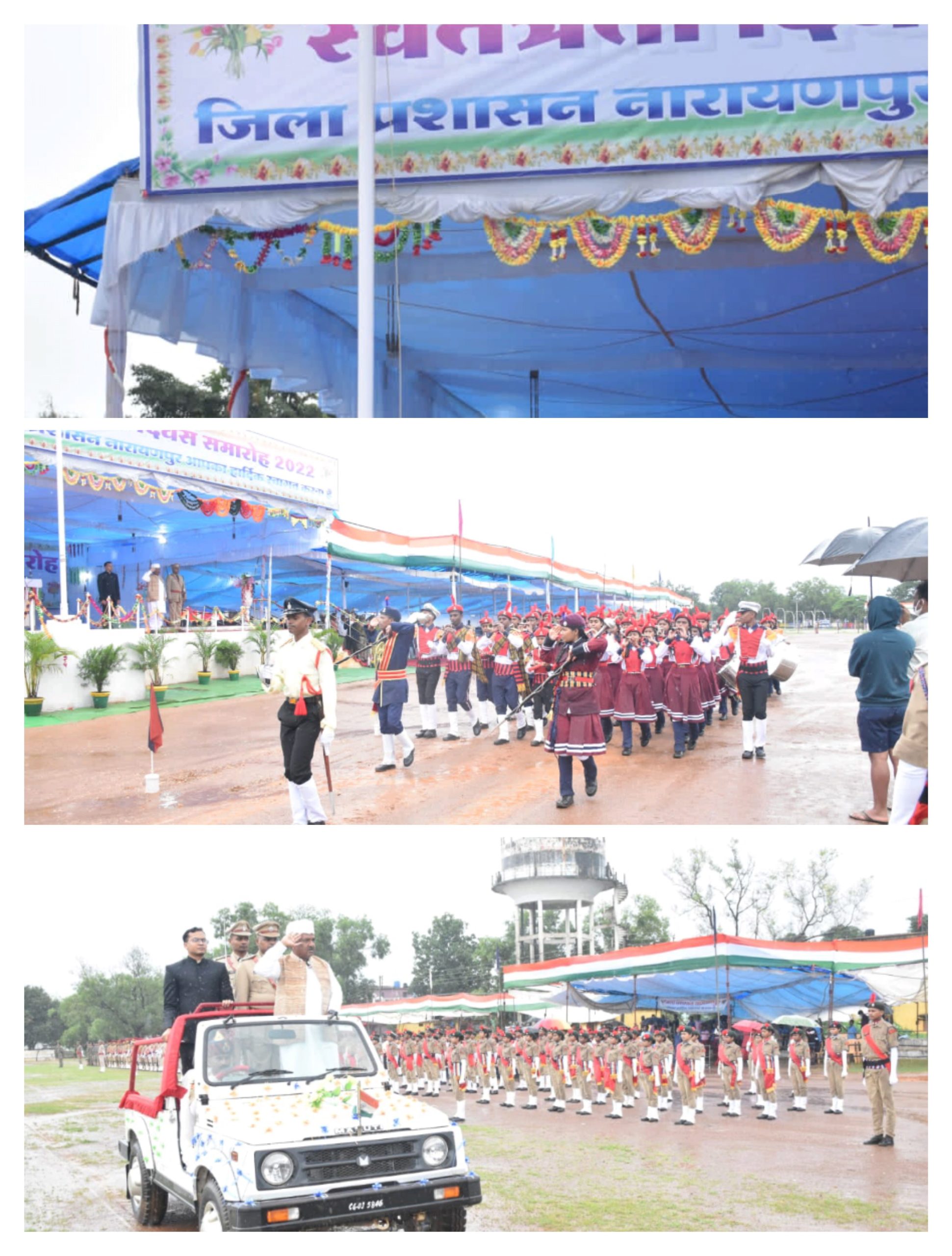 नारायणपुर 15 अगस्त 2022/ राष्ट्रीय पर्व स्वतंत्रता दिवस के 75 वीं वर्षगांठ नारायणपुर जिले में पूरे हर्षोल्लास के साथ मनाई गई। हर बार की तरह इस बार भी जिला मुख्यालय में मुख्य समारोह शासकीय उच्चतर माध्यमिक विद्यालय स्थित खेल परिसर में आयोजित किया गया। इस कार्यक्रम में बतौर मुख्य अतिथि संसदीय सचिव, राजस्व एवं आपदा प्रबंधन, पुनर्वास, वाणिज्यिक कर (पंजीयन एवं मुद्रांक) श्री इन्द्रशाह मण्डावी ने सुबह नौ बजे ध्वजारोहण किया। कार्यक्रम में राष्ट्रगान गाया गया। मुख्य अतिथि ने पुलिस अधीक्षक श्री सदानन्द कुमार और मुख्य कार्यपालन अधिकारी जिला पंचायत श्री देवेश ध्रुव के साथ परेड का निरीक्षण करने के बाद प्रदेश के मुख्यमंत्री श्री भूपेश बघेल का आम जनता के नाम संदेश का वाचन किया। साथ ही एकता और अखंडता का संदेश देते रंग-बिरंगे गुब्बारे नील गगन पर छोड़े गए। इसके साथ ही हर्ष फायर हुआ।