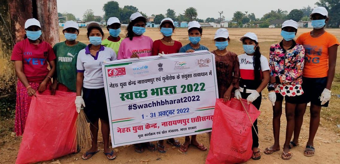 नारायणपुर 09 नवंबर 2022- जिले में स्वच्छता को बढ़ावा देने के उद्देश्य से जिला मुख्यालय नारायणपुर के निकट ग्राम पंचायतों में नेहरू युवा केंद्र संगठन एवं यूनिसेफ छत्तीसगढ़ के तत्वाधान में स्वच्छ भारत 2.0 कार्यक्रम का आयोजन किया गया। इसके तहत् नारायणपुर ब्लाक के ’वॉलिंटियर अपने फोकस 5 ग्राम पंचायतों में स्वच्छता अभियान के तहत खेल मैदान, सार्वजनिक पेयजल स्थल, स्कूल, आंगनबाड़ी, उप स्वास्थ्य केंद्र एवं आसपास के स्थलों में साफ-सफाई की गई। इस कार्यक्रम के तहत लोगों को कैंप आयोजित कर साफ सफाई के संबंध में जागरूक किया गया। इस कार्यक्रम में वलिंटियर्स के द्वारा हैंड ग्लब्स, मास्क, सैनिटाइजर, कैप इत्यादि प्रदान किया गया।