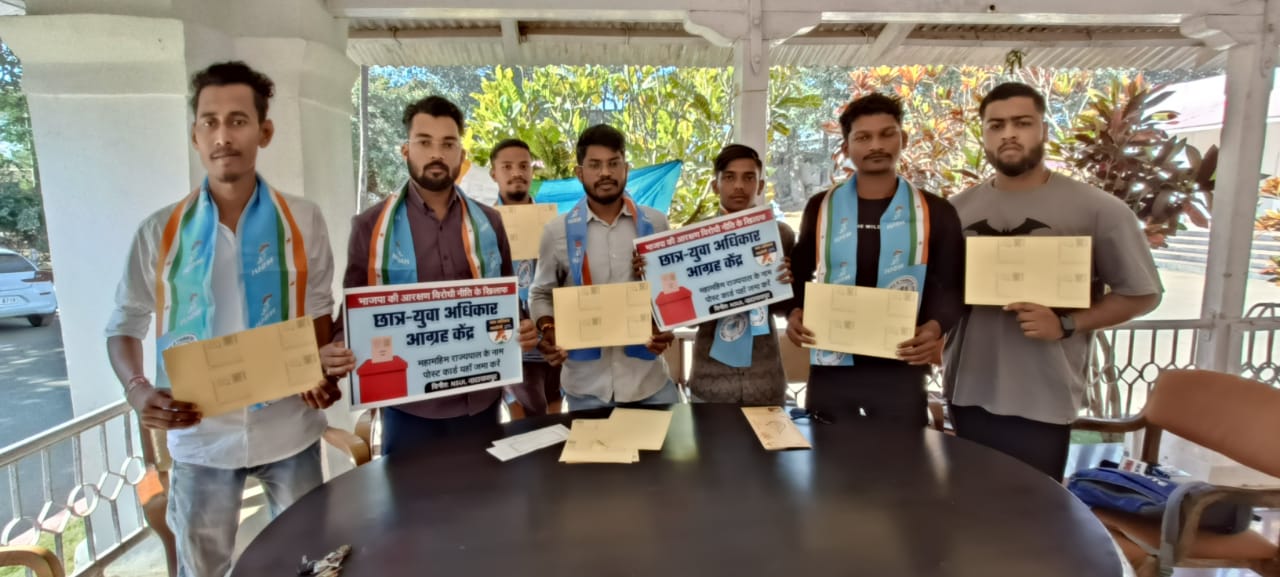 नारायणपुर – आज के प्रेस वार्ता में एनएसयूआई अध्यक्ष विजय सलाम ने बताया कि आज प्रदेश के लगभग सभी वर्ग के युवा व छात्र भाजपा का आरक्षण विरोधी नीति के चलते अपना जीवन अंधकार देख रहा है मुख्यमंत्री जी के भेंट मुलाकात में छात्र छात्रएं अपनी पीड़ा साझा कर रहे है। लगभग 29 दिनों से आरक्षण विधयक को रोक कर रखा गया है ऐसा लगता है की आज राजभवन भाजपा कार्यालयमाय हो गया है जहां भाजपा के इशारे पर राज्यपाल महोदया आरक्षण विधेयक पर हस्ताक्षर नही कर रही है जिसके चलते आज प्रदेश अध्यक्ष नीरज पांडे जी का आह्वान पर पूरे प्रदेश भर में पोस्ट कार्ड का लांच कर रहे है
