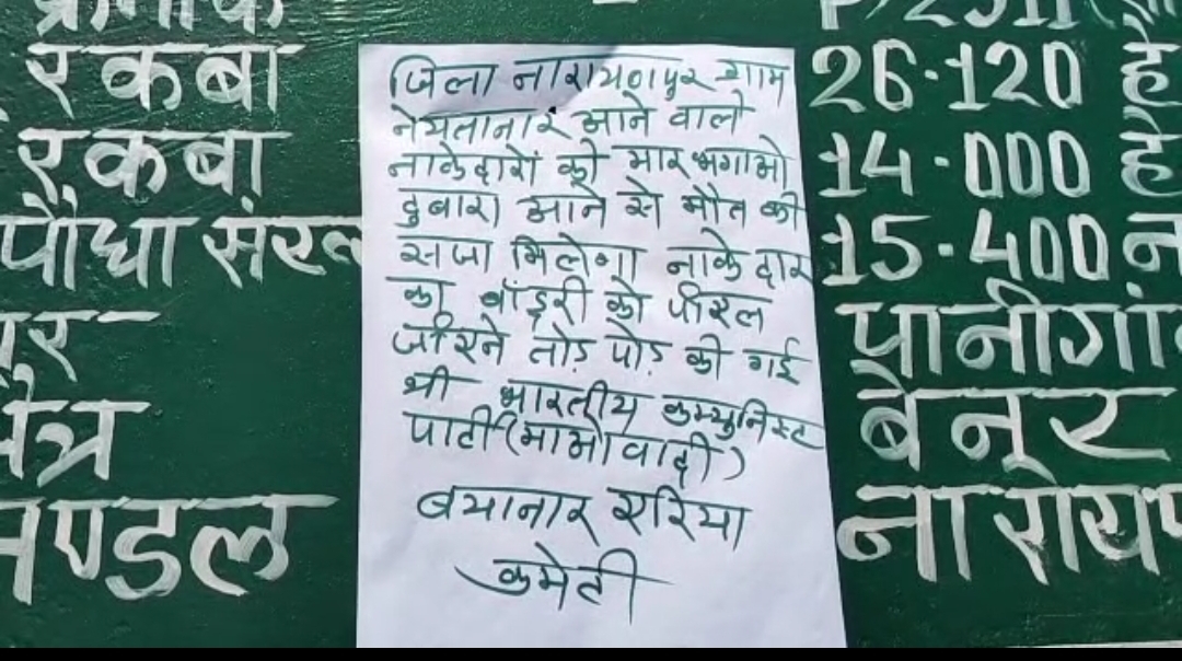 नारायणपुर- बेनूर नक्सल प्रभावित क्षेत्र नारायणपुर में एक बार फिर नक्सलियों ने जमकर उत्पात मचाया है। वन विभाग के प्लांटेशन बिट में तोडफ़ोड़ की। पूरी फेंसिंग बॉउंड्री तार को भी नुकसान पहुंचाया है। बेनूर वन परिक्षेत्र के नेतानार के पानीगांव में तोड़फोड़ किये हैं। मौके पर नक्सलियों ने पर्चा चस्पा किया और वन अमले को काम बंद करने की चेतावनी दी। साथ ही वन अमले के नाकेदार को दी जान से मारने की चेतावनी दी। इलाके में दहशत का माहौल बना हुआ है।