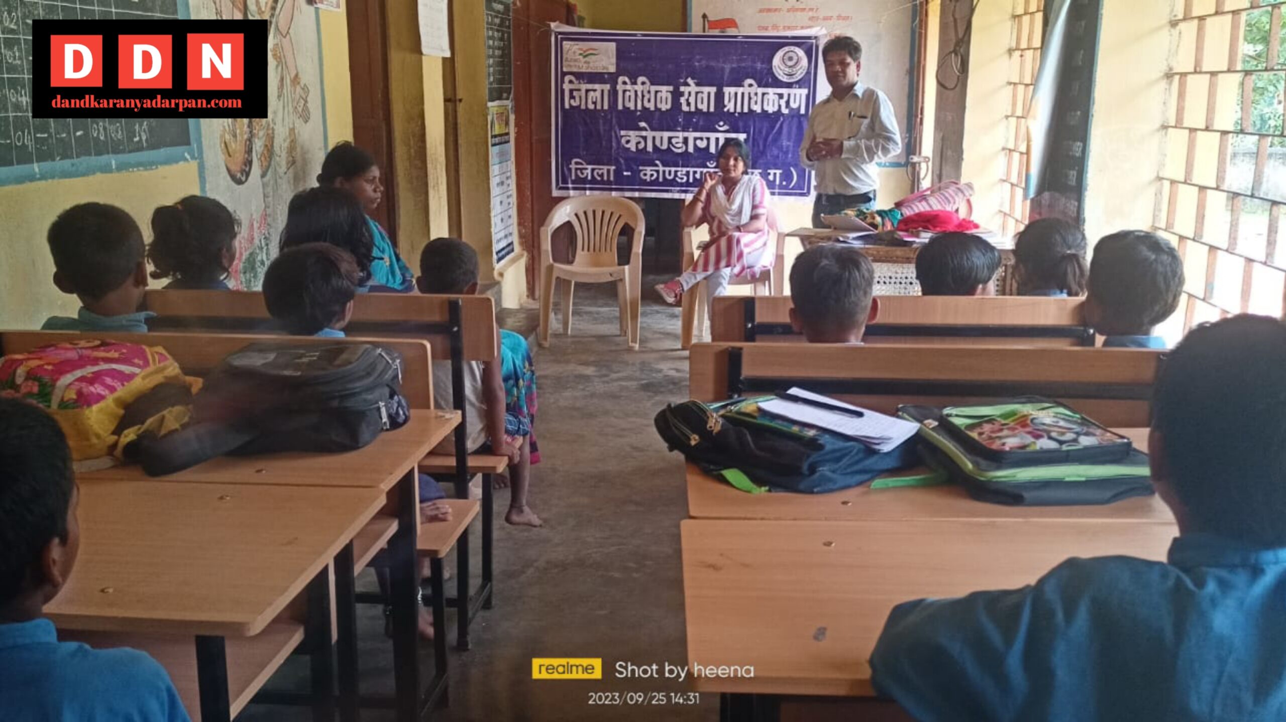 जिला विधिक सेवा प्राधिकरण कोंडागांव श्रीमान उत्तरा कुमार कश्यप जिला व सत्र न्यायाधीश अध्यक्ष विधिक सेवा प्राधिकरण कोंडागांव, श्रीमती अंबा साह सचिव जिला विधिक सेवा प्राधिकरण कोंडागांव, श्रीमान हरेंद्र सिंह नाग मुख्य न्यायिक मजिस्ट्रेट नारायणपुर अध्यक्ष तालुका समिति नारायणपुर के आदेश अनुसार आज दिनांक 25/09/2023 दिन सोमवार को स्थान = प्राथमिक शाला मरदेल में विधिक साक्षरता शिविर आयोजित किया गया व उपस्थित बच्चो को श्रीमती हीना नाग, पी.एल.व्ही. किशोर न्याय बोर्ड नारायणपुर के द्वारा गुड टच बेड टच, बाल अधिकार एवम् बच्चों से मैत्री पूर्ण व्यवहार व व्यक्तिगत सुरक्षा के संबंध में जानकारी दी गई एवम् श्री घासी राम नेताम पी एल वी प्रबन्ध कार्यालय नारायणपुर के द्वारा विधिक सेवा प्राधिकरण का परिचय देते हुए निःशुल्क विधिक सेवा के संबंध में व बाल श्रम निषेध अधिनियम संबंध में जानकारी दी गई। जिसमे प्राथमिक शाला मरदेल की शिक्षिका निशा थावरे उपस्थित रही जिन्हाने अंत में समाप्ति की ओर चलते हुए धन्यवाद ज्ञापित किया।