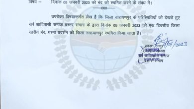 सर्व आदिवासी समाज का नारायणपुर में जिला मुख्यालय बंद, धरना व रैली स्थगित