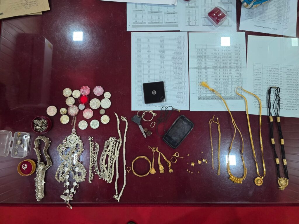 01. सोन का मंगलसुत्र 01 नग 02. सोने का माला 02 नग 03. सोने का चैन 02 नग, 04. सोने का लॉकेट 02 नग, 05. सोने का मंगलसूत्र 01, 06. सोने का झूमका, 07. सोने का अंगूठी 01 नग, 08. सोने की सलाई 01 नग, 09. सेाने करी बिंदिया 01 नग, 10. सोने का कंगन 01 जोड़ी, 11. सोने का नाल 01 नग, 12. चांदी की बिंछिया 18 नग, 13. चांदी का नाल 02 नग, 14. चांदी का लॉकेट 01 नग, 15. चांदी का करघन 01 नग, 16. चोदी का पायेजेब 01 जोड़ी 17. चांदी का पैरपट्टी 04 जोड़ी, 18. चांदी के सिक्के 18 नग, 19. सोने की बाली 01 नग, 20. पूरानी इस्तेमाली स्कूटी 01 नग व जियो वाईफाई कुल जुमला कीमती 11,97,000/- (शब्दो में ग्यारह लाख सन्तानबे हजार रूपये ) की सामग्री।