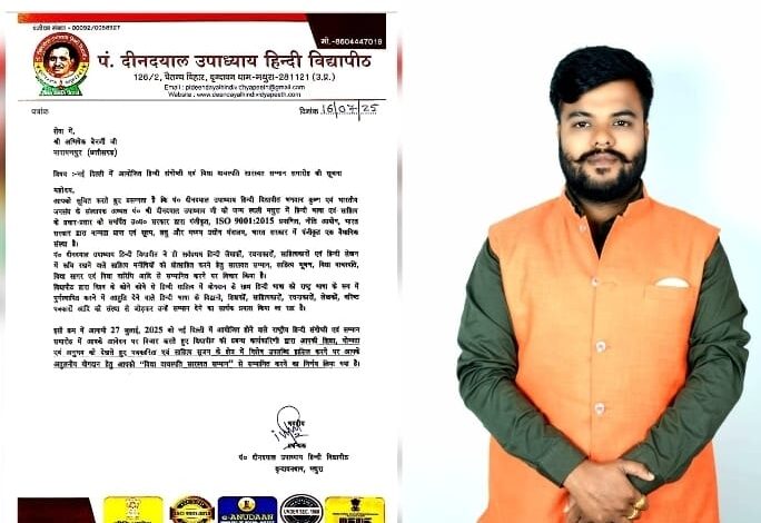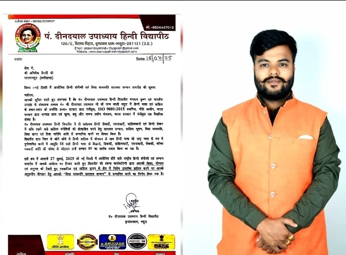 बतादे, पंडित दीनदयाल उपाध्याय हिंदी विद्यापीठ वृंदावन धाम, मथुरा विश्वस्तर पर हिंदी भाषा के प्रचार-प्रसार के लिये विख्यात है भारतीय संस्कृति को हिंदी भाषा के माध्यम से विश्वपटल पर लाने में विद्यापीठ की अहम भूमिका रही है विद्यापीठ के कुलपति डॉ इंदु भूषण मिश्रा ‘देवेंदु’ ने विद्यापीठ की ओर से एक पत्र जारी करते हुए नारायणपुर जिले के हिंदी भाषा के युवा पत्रकार अभिषेक बेनर्जी को सूचित किया कि विश्व हिंदी दिवस 27 जुलाई को नई दिल्ली में आयोजित होने वाले विद्यापीठ के भव्य कार्यक्रम में श्री बेनर्जी को हिंदी भाषा मे उत्कृष्ट पत्रकारिता, हिंदी साहित्य सृजन के क्षेत्र में योगदान के लिये विधावाचस्पति अर्थात “डॉक्टरेट” की मानद उपाधि से सम्मानित किया जाएगा,यह उपाधि हिंदी भाषा में उत्कृष्ट पत्रकारिता एवं हिंदी साहित्य सृजन के क्षेत्र में विशेष योगदान के लिये दी जाती है,