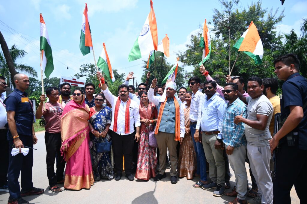 नारायणपुर – भाजयुमो जिला नारायणपुर द्वारा प्रदेश नेतृत्व के आव्हान पर “हर घर तिरंगा – हर मन तिरंगा” अभियान अंतर्गत विशाल तिरंगा यात्रा निकाली गई। इस यात्रा को जिला पंचायत कार्यालय के सामने से छत्तीसगढ़ शासन के उपमुख्यमंत्री विजय शर्मा और केबिनेट मंत्री व नारायणपुर विधायक केदार कश्यप ने हरी झंडी दिखाकर रवाना किया।