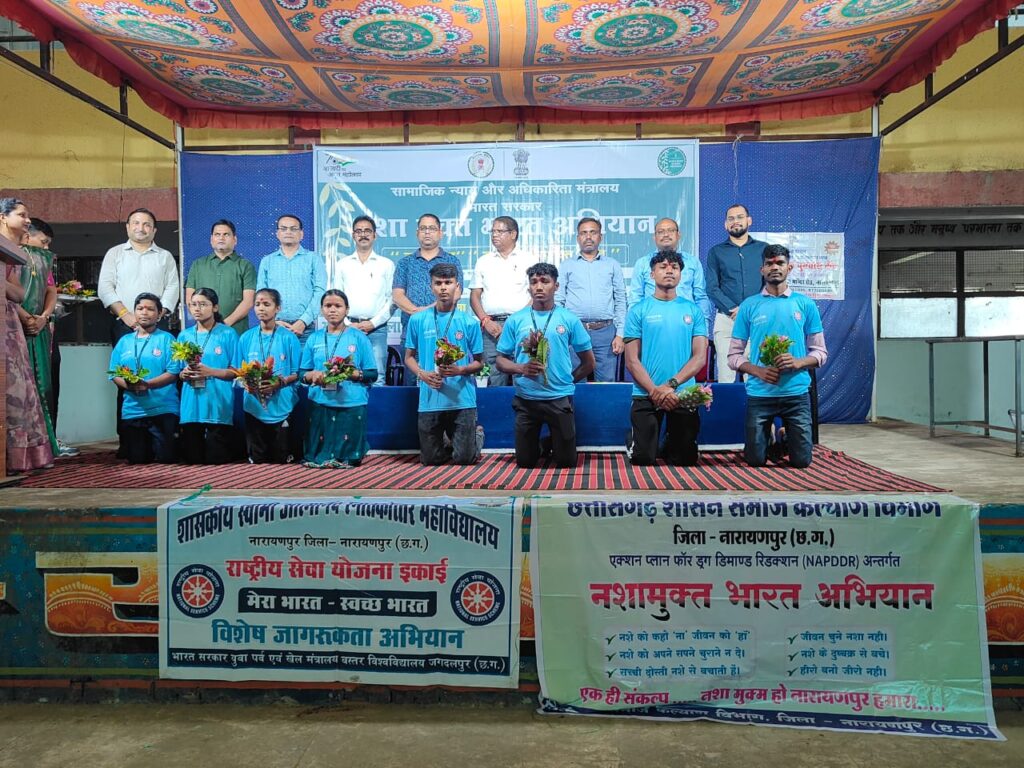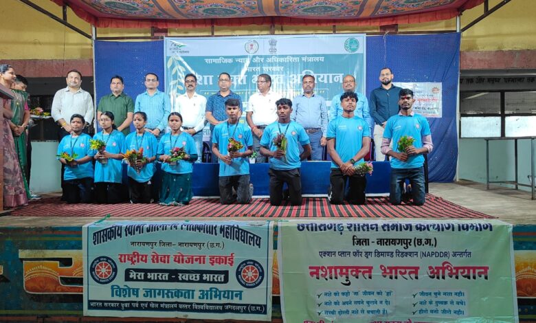 नारायणपुर, 13 अगस्त 2025 // सामाजिक न्याय एवं अधिकारिता मंत्रालय, भारत सरकार द्वारा संचालित नशा मुक्त भारत अभियान वर्ष 2020 में प्रारंभ किया गया था और इस वर्ष यह अपने पांच वर्ष पूर्ण कर रहा है। इसका उद्देश्य देश के सभी जिलों में नशे के दुष्प्रभावों के प्रति जन-जागरूकता फैलाना तथा समाज में नशा मुक्त वातावरण तैयार करना है। नशा मुक्त भारत अभियान की 5वीं वर्षगांठ के अवसर पर जिले में 01 से 31 अगस्त 2025 तक जन-जागरूकता गतिविधियों का आयोजन किया जा रहा है, जिसमें 13 अगस्त को विशेष रूप से नशे के दुष्प्रभावों के प्रति जन-जागरूकता तथा समाज में नशा मुक्त वातावरण विकसित करने हेतु स्वामी आत्मानंद महाविद्यालय के छात्र छात्राओं को प्राचार्य एस.आर. कुजांम के द्वारा सामूहिक रूप से शपथ ग्रहण कराया गया तथा उप संचालक समाज कल्याण श्याम सुन्दर रैदास के द्वारा कार्यक्रम में नशा से होने वाले दुष्परिणामों के संबंध में छात्र छात्राओं को अवगत कराया गया। उक्त कार्यकम में महाविद्यालय एवं समाज कल्याण विभाग के कर्मचारीगण उपस्थित रहे।