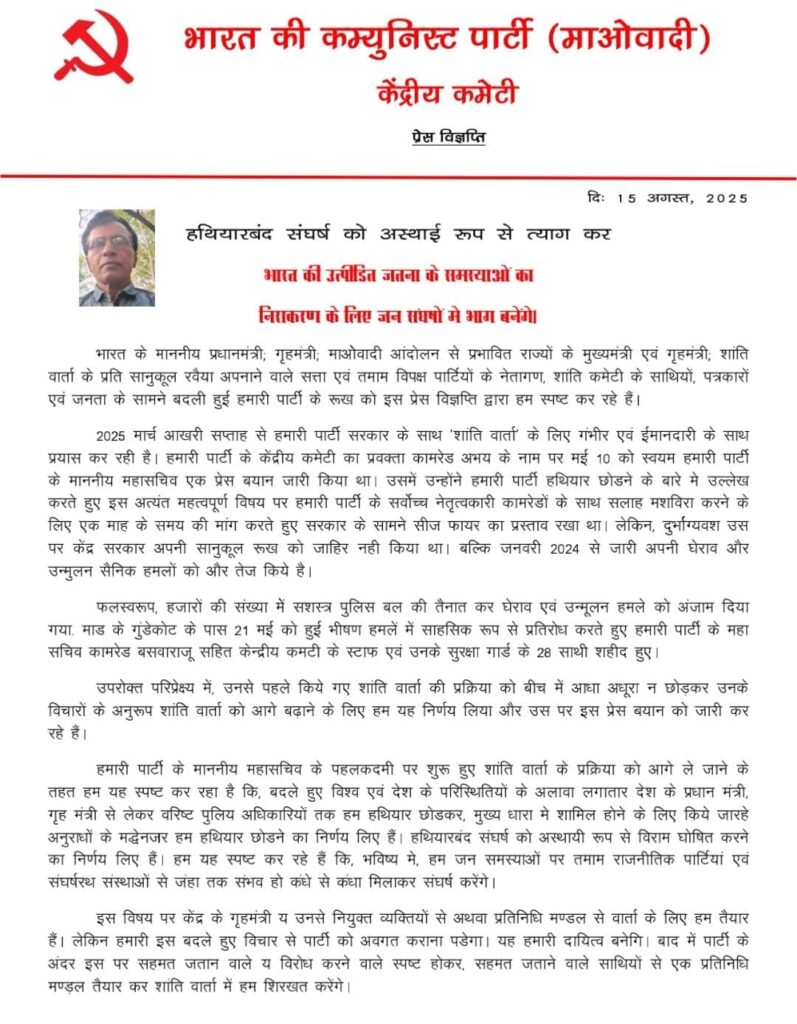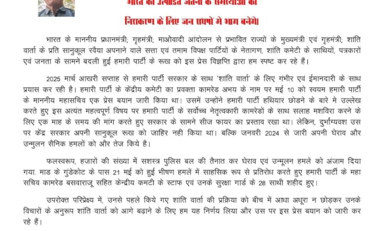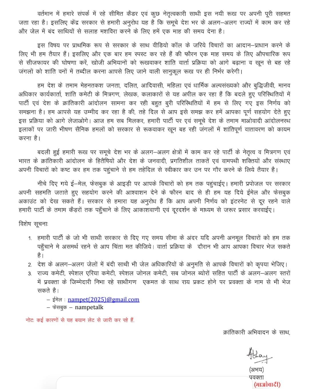 माओवादी पार्टी के केंद्रीय प्रवक्ता अभय ने पर्चा जारी कर ऐलान किया है कि माओवादियों ने हथियारबंद संघर्ष को अस्थाई तौर पर विराम देने की घोषणा की. उन्होंने मांग की है कि केंद्र सरकार एक समिति गठित करे, ताकि वो वार्ता कर सकें. प्रवक्ता अभय ने एक ईमेल आईडी जारी कर सरकार से उस पर अपना विचार भेजने की बात भी कही है. साथ ही सरकार से एक महीने का सीजफायर करने का निवेदन भी किया है, जिससे वे अपने सभी नेतृत्व करने वाले साथियों से इस विषय पर चर्चा कर सकें.