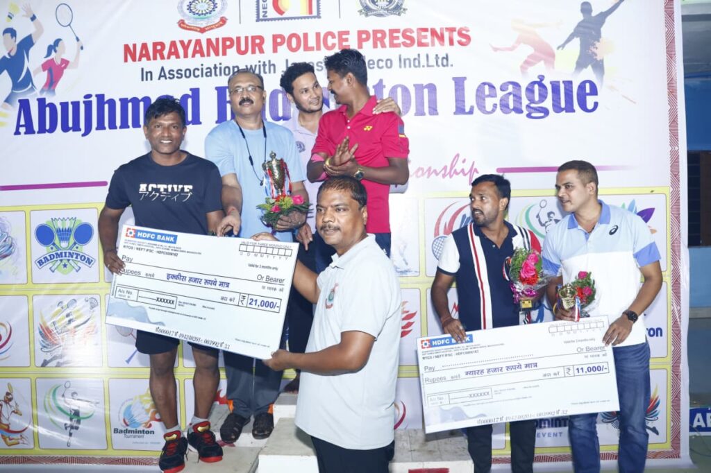 आज दिनांक 20-09-2025 को मुख्य अतिथि माननीय श्री केदार कश्यप, मंत्री वन एवं जलवायु परिवर्तन, परिवहन, सहकारिता, संसदीय कार्य, छत्तीसगढ़ शासन द्वारा नारायणपुर पुलिस द्वारा आयोजित ‘‘अबूझमाड़ खेल उत्सव 2025‘‘ के अंतर्गत आयोजित ‘अबूझमाड़ बैडमिंटन लीग 2025 – सीज़न 2’ के विजेता टीम के खिलाडियों को पुरस्कृत किया गया। प्रतियोगिता के ओपन केटेगरी और वेटेरन्स केटेगरी में प्रथम, द्वितीय एवं तृतीय स्थान प्राप्त करने वाले टीम को क्रमशः 31 हजार, 21 हजार एवं 11 हजार रूपये तथा ओपन केटेगरी में चतुर्थ स्थान अर्जित करने वाली टीम को 7 हजार रुपये तथा कॉर्टर फाइनल खेलने वाले सभी टीम को 5-5 हजार रुपये नगद राशि के साथ ट्रॉफी भेंट कर पुरस्कृत किया गया।