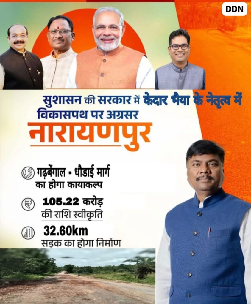 यह चित्र छत्तीसगढ़, भारत का एक राजनीतिक पोस्टर है, जो भाजपा नेता केदार कश्यप के नेतृत्व में नारायणपुर में विकास को बढ़ावा दे रहा है।