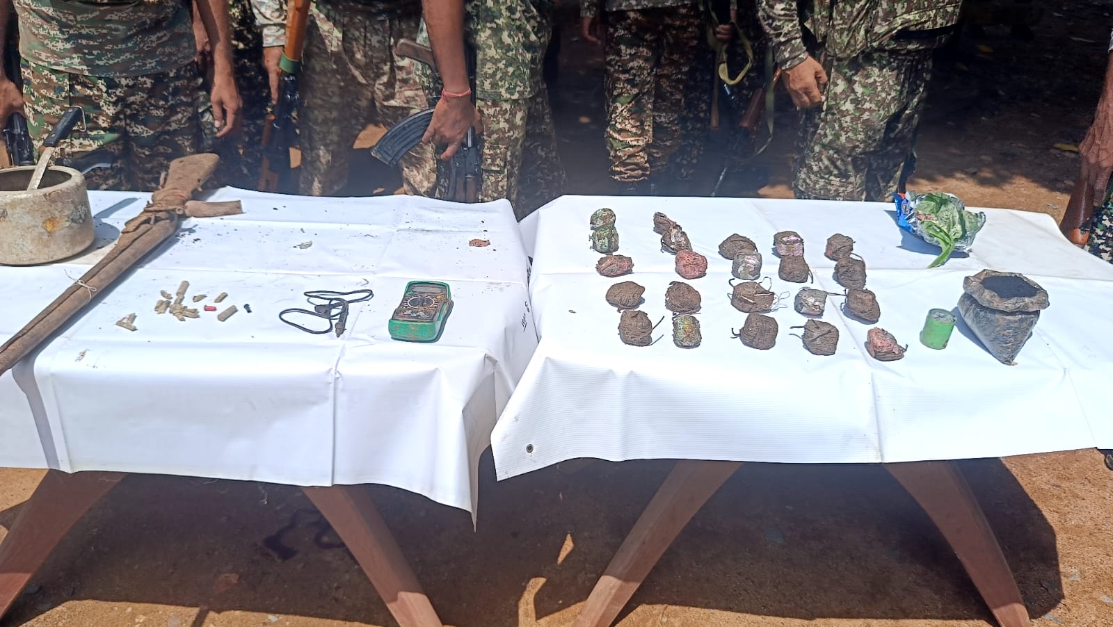 प्रेशर कुकर बम, इलेक्ट्रिक मल्टीमीटर वायर सहित, बारूद और भरमार राइफल हुआ बरामद।