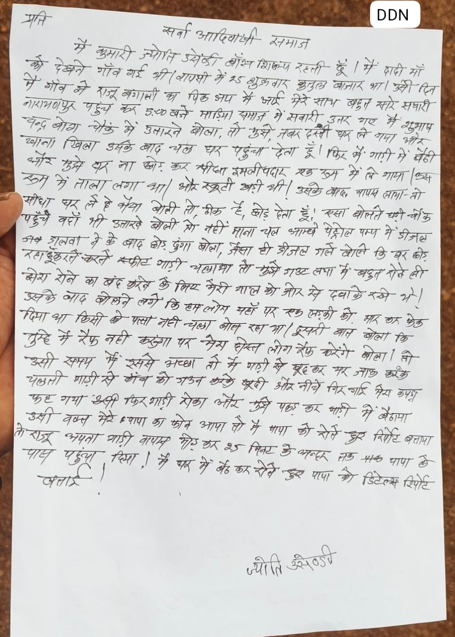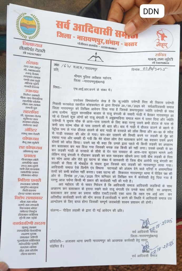 यह घटना अबूझमाड़ के फरसबेड़ा तहसील कोहकामेटा आदिवासी युवती का है जिन्होंने दिनांक 02/10/2025 को सर्वआदिववासी समाज जिला नारायणपुर को लिखित आवेदन दिया गया है जिसके कथनानुसार आदिवासी युवती के साथ अन्य ग्रामीण मौजूद थे जो कुतुल साप्ताहिक बाजार से राजू बंगाली की सवारी गाड़ी में बैठकर नारायणपुर आ रहे थे जिसमें कुछ लोगों को राजू बंगाली ने अबुझमाड़िया समाज भवन में उतार दिया और युवती ने सुभाष चौक के आस-पास उतारने के लिए कहा लेकिन राजू बंगाली उसे कभी होटल के पास तो कभी जय स्तम्भ चौक के पास उतारने की बात करता बाद में गाड़ी में डीजल डालने के बहाने से पेट्रोल पम्प ले गया डीजल डालने के बाद गाड़ी के दरवाजे को लॉक किया और 80-90 के स्पीड से गाड़ी रावघाट की ओर ले गया।