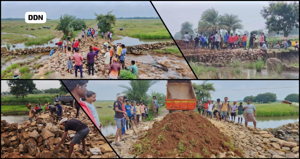 सड़क निर्माण में ग्रामीणों का श्रमदान बिना सरकारी सहायता के बना रहे सड़क सारी सड़के बाढ़ में बह गई और पुल पुलिया अधूरे टूटू पड़े है