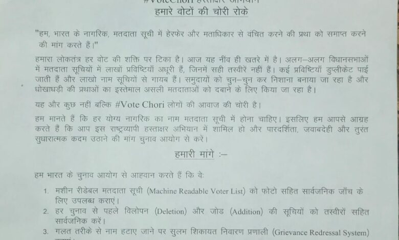 वोट चोर गद्दी छोड़ कार्यक्रम के तहत हस्ताक्षर अभियान का आगाज जिले मे आज से …..