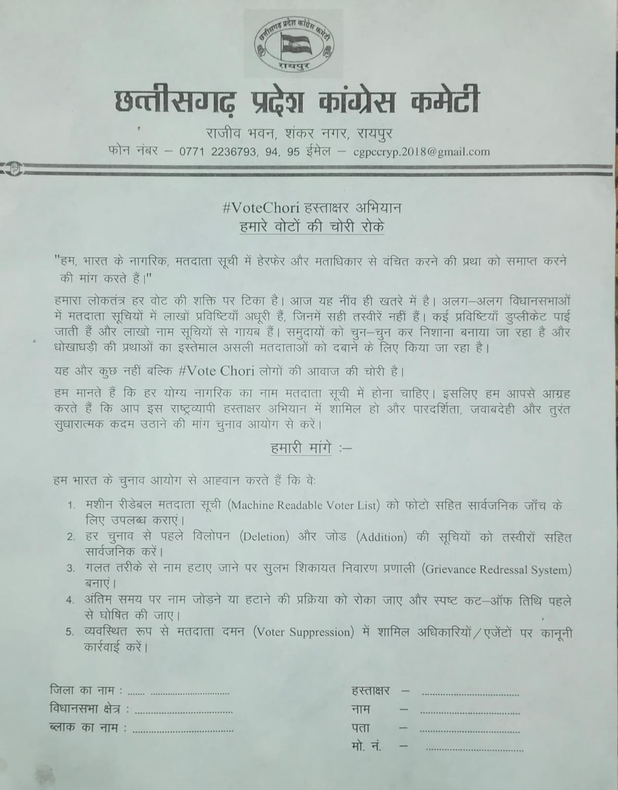 Chhattisgarh: वोट चोर गद्दी छोड़ कार्यक्रम के तहत हस्ताक्षर अभियान का आगाज जिले मे आज से …..