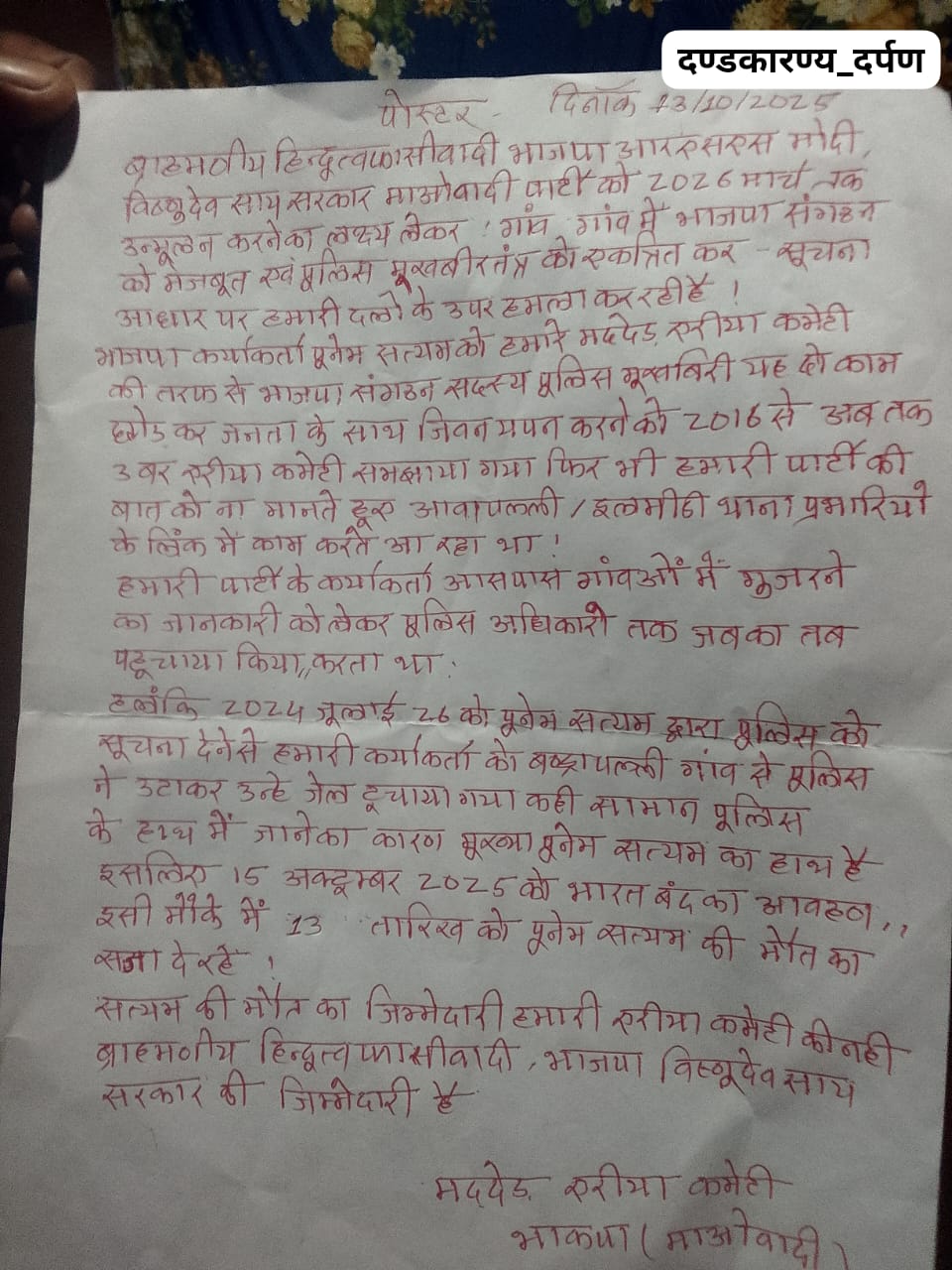 यही नहीं बल्कि पूनम सत्यम पर पर्ची जारी कर पुलिस मुखबिरी का भी आरोप लगाया ।मद्देड़ एरिया कमेटी ने पर्ची जारी ,कहा 2016 से कई बार दी गई थी चेतावनी ।