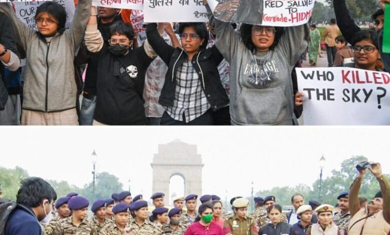 इंडिया गेट पर छात्राओं ने वायु प्रदूषण के खिलाफ किया प्रदर्शन- प्रदर्शन में केंद्र सरकार के खिलाफ और नक्सलियों के समर्थन में नारे लगाए गए