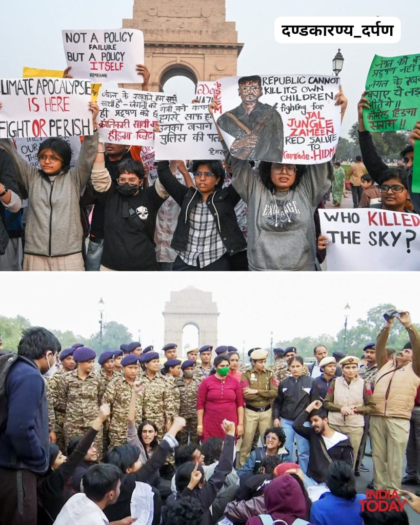 इंडिया गेट पर हुआ प्रदर्शन विवादों में घिर गया है यहां वायु प्रदूषण के प्रदर्शन के दौरान नक्सली कमांडर ‘हिडमा अमर रहे’ के नारे लगाए गए।