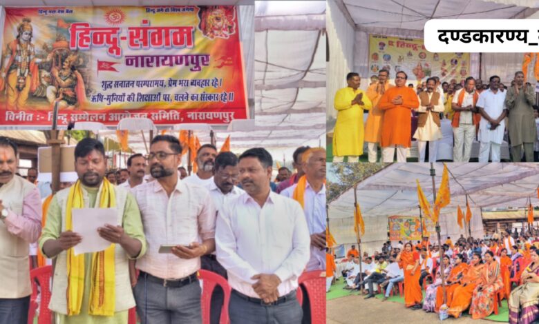 छत्तीसगढ़ के नारायणपुर – नगर में आज हिंदू संगम कार्यक्रम आयोजित किया गया- स्थान पुराना बस स्टैंड परिसर में आयोजित हिंदू संगम का दृश्य जनउपस्थिति, अनुशासन और उत्साह से भरा हुआ रहा- सुबह से ही नगर एवं आसपास के ग्रामों से लोगों का सैलाब उमड़ पड़ा, जिससे पूरा परिसर जनमानस की ऊर्जा और राष्ट्रभावना से गूंज उठा- मातृशक्ति-युवा- विद्यार्थी, संत समाज-विभिन्न सामाजिक संगठनों एवं नागरिकों ने बड़ी संख्या में भाग लेकर कार्यक्रम को ऐतिहासिक बना दिया