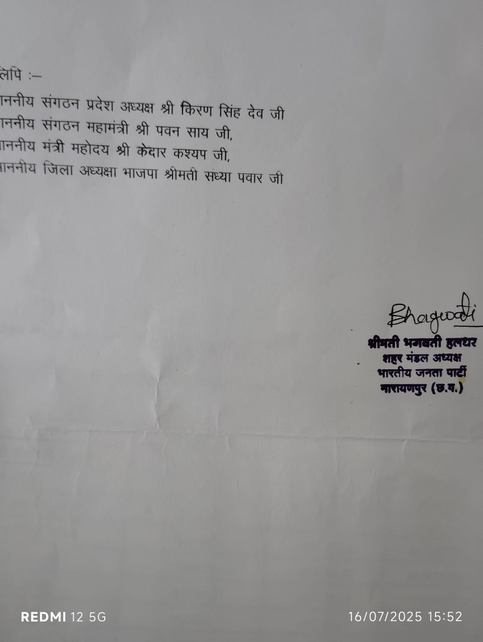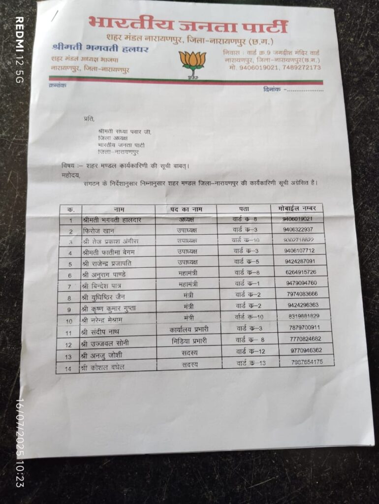 नारायणपुर भाजपा शहर मंडल की नई कार्यकारिणी घोषित: 41 सदस्य टीम में 4 उपाध्यक्ष, 2 महामंत्री समेत 14 महिलाएं शामिल