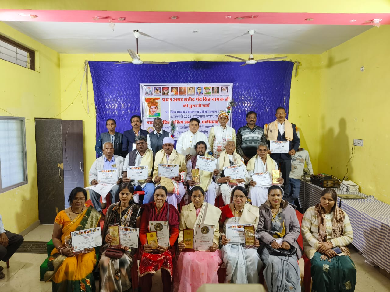 18 जनवरी, रविवार को समारोह के मुख्य अतिथि वरिष्ठ सामाजिक कार्यकर्ता सुंदरदास मानिकपुरी, विशिष्ट अतिथि अ.भा.आदिवासी हल्बा/हल्बी समाज के राष्ट्रीय पदाधिकारी शिवकुमार पात्र, राष्ट्रपति पुरस्कृत अंतर्राष्ट्रीय कलाकार करमा सम्राट घनश्याम सिंह ठाकुर, अकादमी की संरक्षक श्रीमती सुशीला देवी वाल्मीकि एवं प्रांताध्यक्ष प्रो.जी.आर.बंजारे ‘ ज्वाला ‘के करकमलों से उक्त सम्मान प्रदान किया गया।