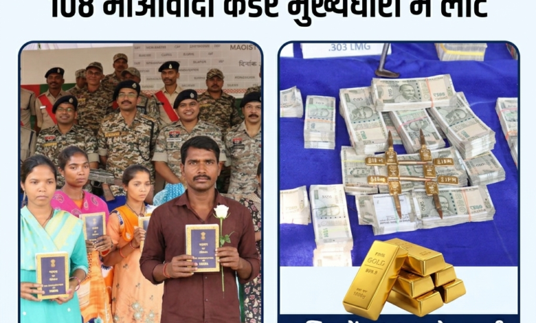 बस्तर में 108 माओवादी कैडरों का आत्मसमर्पण, सुरक्षा बलों को 101 हथियार और करोड़ों की नकदी बरामद
