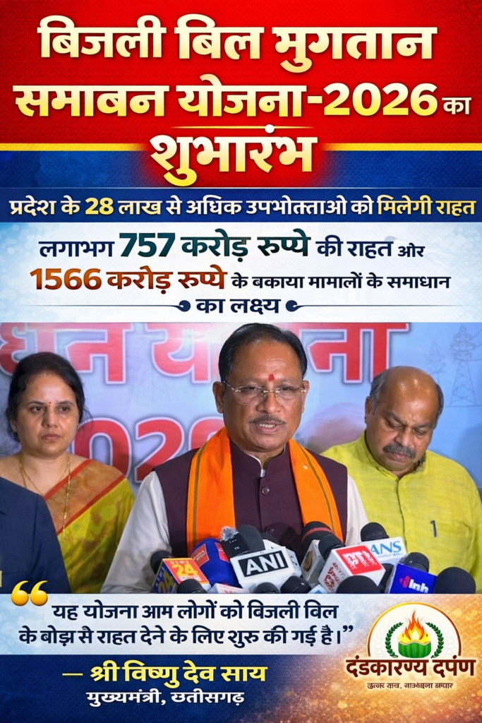 Vishnu Deo Sai ने आम नागरिकों को राहत देने के उद्देश्य से “बिजली बिल भुगतान समाधान योजना–2026” की शुरुआत की है। राज्य सरकार का कहना है कि इस योजना से लाखों बिजली उपभोक्ताओं को बकाया बिल के भुगतान में राहत मिलने की उम्मीद है।