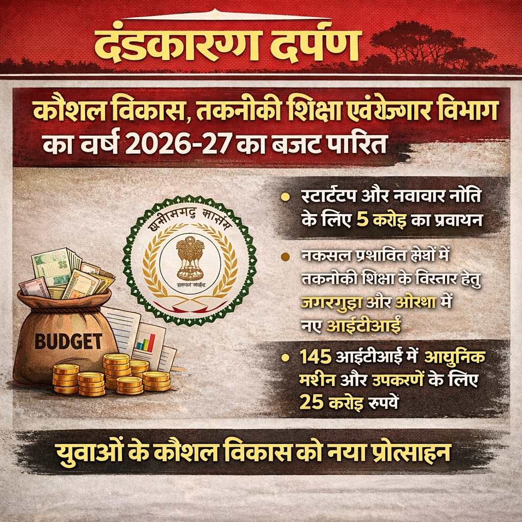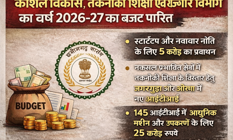 Chhattisgarh:;कौशल विकास, तकनीकी शिक्षा एवं रोजगार विभाग का वर्ष 2026-27 का बजट पारित स्टार्टअप और नवाचार को बढ़ावा, छात्र स्टार्टअप नीति के लिए 5 करोड़ का प्रावधान
