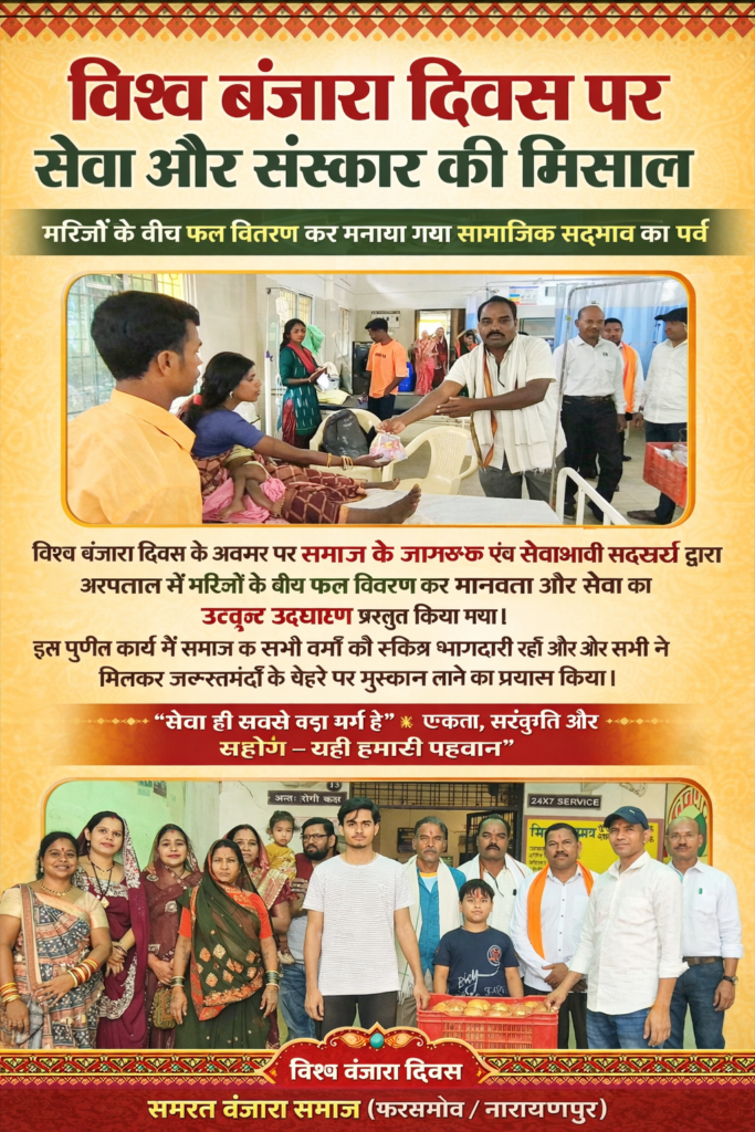 कोंडागांव। फरसगांव ब्लॉक में विश्व बंजारा दिवस के अवसर पर बंजारा समाज ने सामाजिक सरोकार और सांस्कृतिक एकता का प्रेरणादायी उदाहरण प्रस्तुत किया। इस मौके पर समाज के लोगों ने सामुदायिक स्वास्थ्य केंद्र पहुंचकर मरीजों के बीच फल और शीतल पेय पदार्थ वितरित किए तथा उनके शीघ्र स्वास्थ्य लाभ की कामना की।