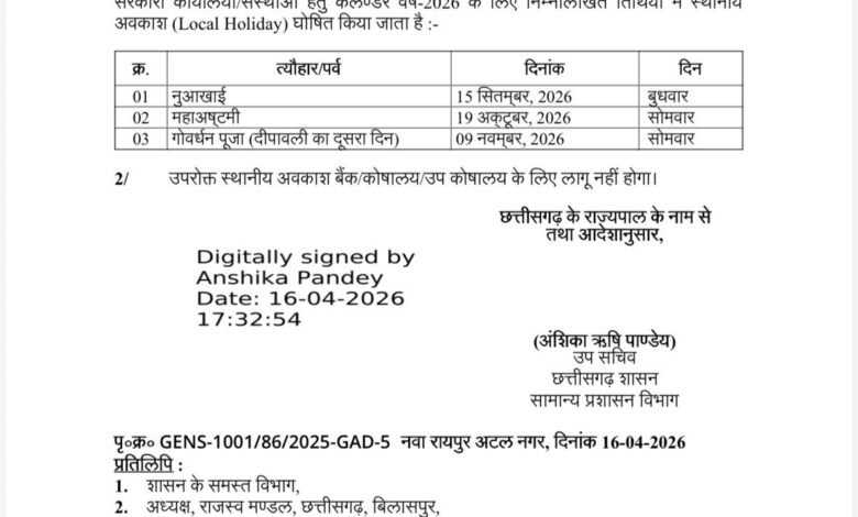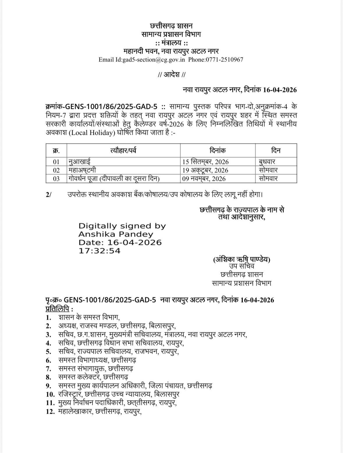 छत्तीसगढ़ में परंपरा, संस्कृति और लोक जीवन से जुड़े प्रमुख पर्वों को सम्मान देते हुए राज्य सरकार ने नुआखाई पर्व, महाष्टमी और गोवर्धन पूजा के अवसर पर सार्वजनिक अवकाश घोषित किया है। सामान्य प्रशासन विभाग द्वारा इस संबंध में आदेश जारी कर दिए गए हैं, जिसके बाद पूरे प्रदेश में उत्सव का माहौल बन गया है। इस निर्णय को सांस्कृतिक अस्मिता और परंपराओं के सम्मान की दिशा में एक महत्वपूर्ण कदम माना जा रहा है।
