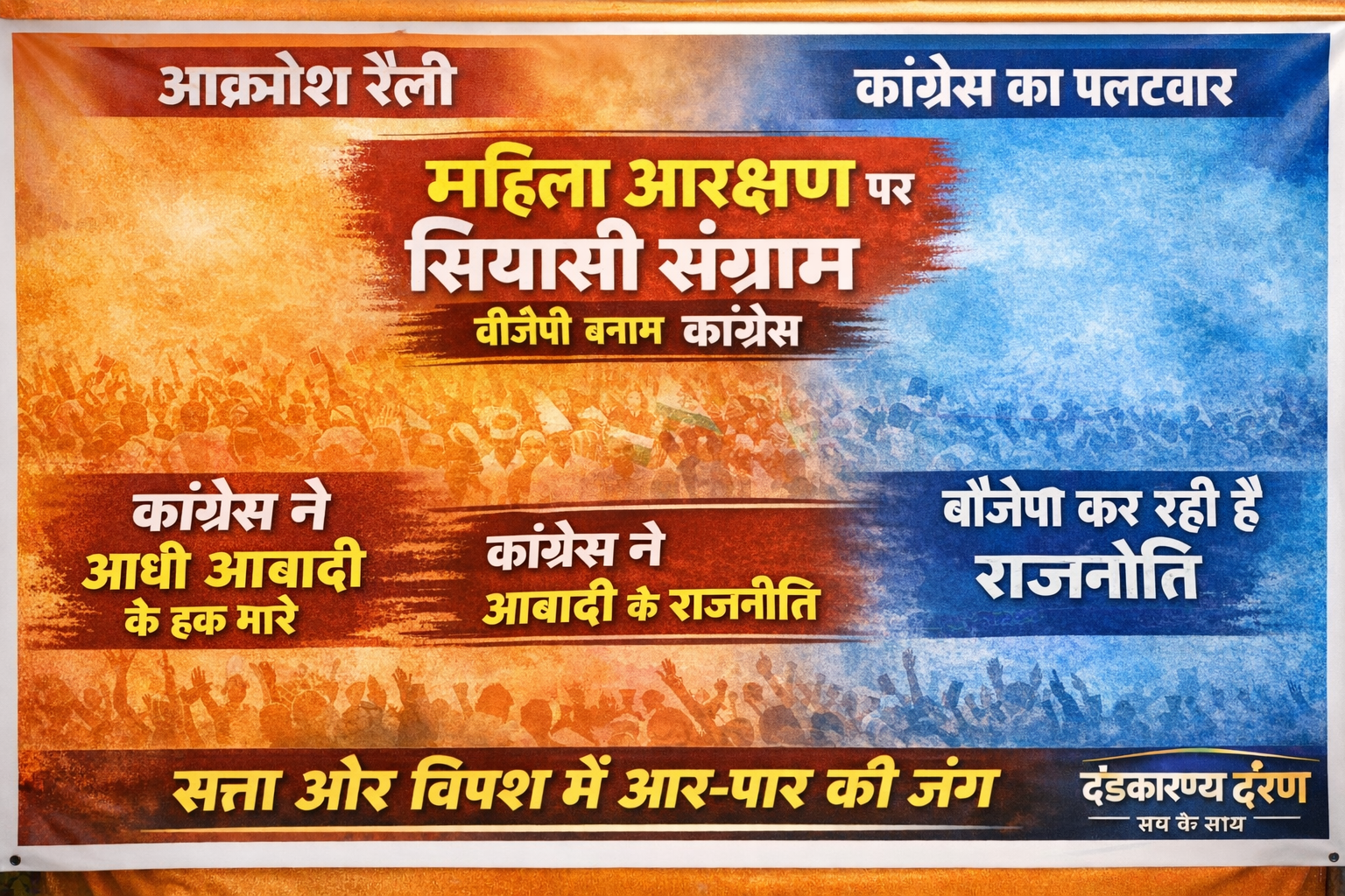 महिला आरक्षण को लेकर छत्तीसगढ़ में सियासी संग्राम तेज हो चुका है। जहां बीजेपी इसे महिलाओं के सम्मान और अधिकार का मुद्दा बता रही है, वहीं कांग्रेस इसे चुनावी रणनीति करार दे रही है।