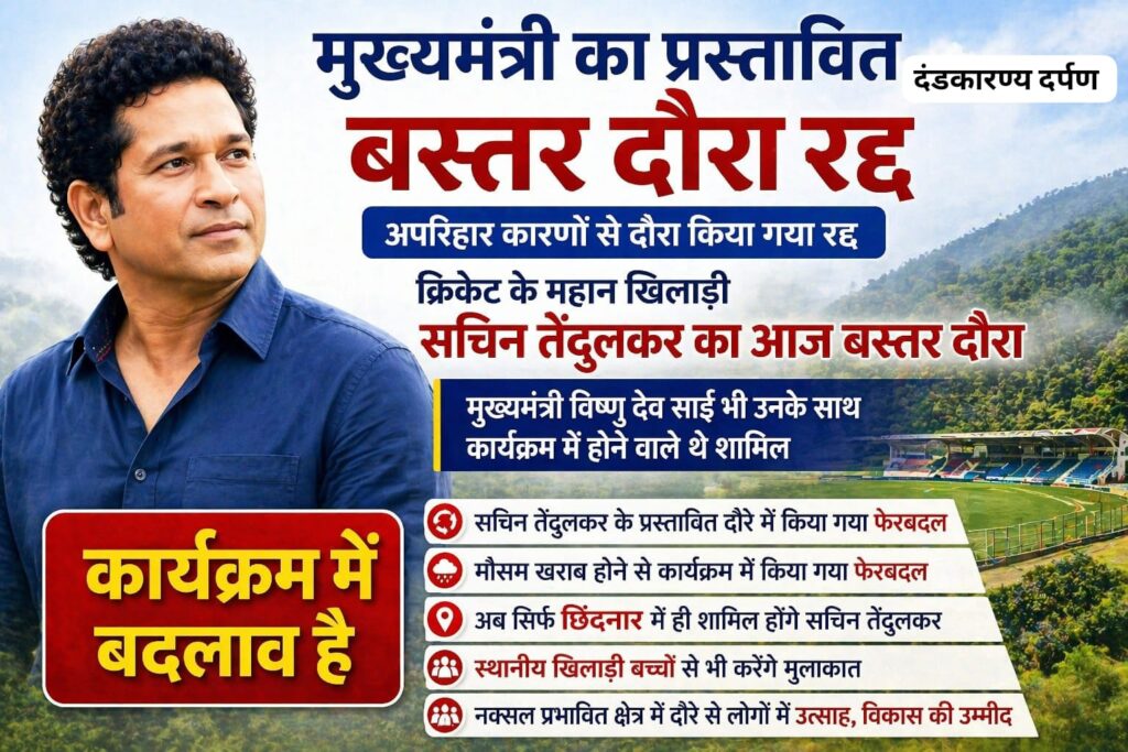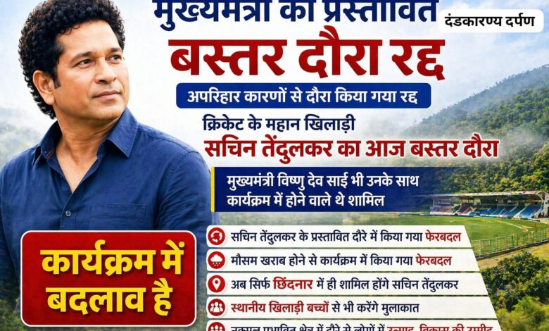 जानकारी के अनुसार, खराब मौसम की स्थिति को देखते हुए न केवल मुख्यमंत्री का दौरा रद्द किया गया, बल्कि सचिन तेंदुलकर के कार्यक्रम में भी फेरबदल किया गया है। पहले उनका दौरा बस्तर के कई अंदरूनी क्षेत्रों में निर्धारित था, लेकिन अब वे केवल छिंदनार में ही कार्यक्रम में शामिल होंगे।