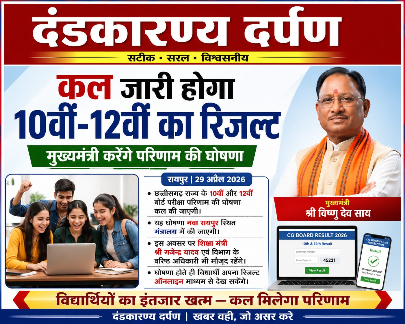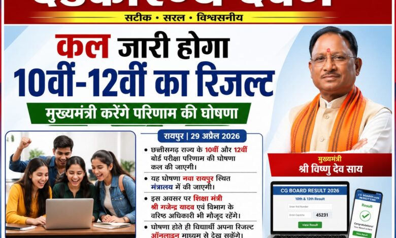 कल मुख्यमंत्री 10वीं और 12वीं बोर्ड परीक्षा परिणाम की घोषणा करेंगे।
