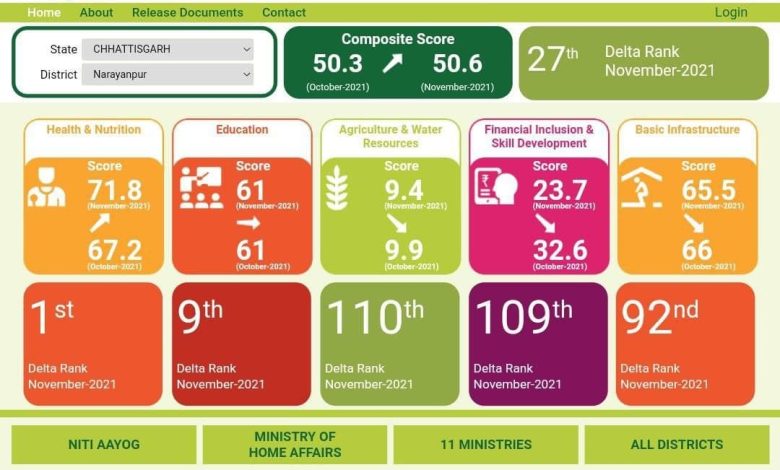नीति आयोग द्वारा आकांक्षी जिलों के नवम्बर 2021 की डेल्टा रैंकिंग जारी की गई, जिसमें नारायणपुर जिला ने स्वास्थ्य और पोषण में पहला स्थान प्राप्त किया है। स्वास्थ्य और पोषण, वित्तीय समावेश और कौशल विकास ,आधारभूत अधोसंरचना के मानकों में सुधार आने से डेल्टा रैंकिंग की कम्पोजिट स्कोर में नारायणपुर जिला का 27वें स्थान रहा। वहीं वित्तीय समावेश व कौशल विकास में 109 वें, शिक्षा में 9वां , कृषि में 110वे, आधारभूत संरचना में 92वें डेल्टा रैंकिंग में नारायणपुर जिला को दिया गया है।