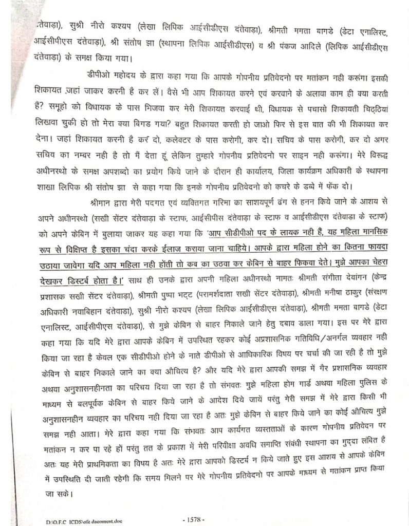 अधिकारी की स्वेच्छाचारिता का आलम तो देखिए कहा जा रहा है कि आपकी CR कचरे के डबे में फेंक दी जाएगी | CR पर नमाकन नहीं करूंगा | जहाँ शिकायत करनी है , कर दो । विधायक , विभागीय सचिव , कलेक्टर से शिकायत कर को मेरा कुछ नहीं बिगड़ने वाला ! पूर्व में भी बृजेंद्र सिंह ठाकुर द्वारा CR बिगाड़ने संबंधी धमकियाँ खुलेआम दी जाती रही हैं । अधीनस्थों को स्वयं अपने केबिन में बुलाया जाकर परियोजना अधिकारी को केबिन से बाहर निकाले जाने हेतु जिला कार्यक्रम अधिकारी द्वारा दबाव डाला गया । यह महिला मानसिक रूप से विक्षिप्त है , इसका चंदा करके ईलाज कराया जाना चाहिये । ‘ जैसे शब्दों का प्रयोग किसी भी स्थिति में किसी प्रयोग किया जाना सही प्रतीत नहीं हो रहा है ।