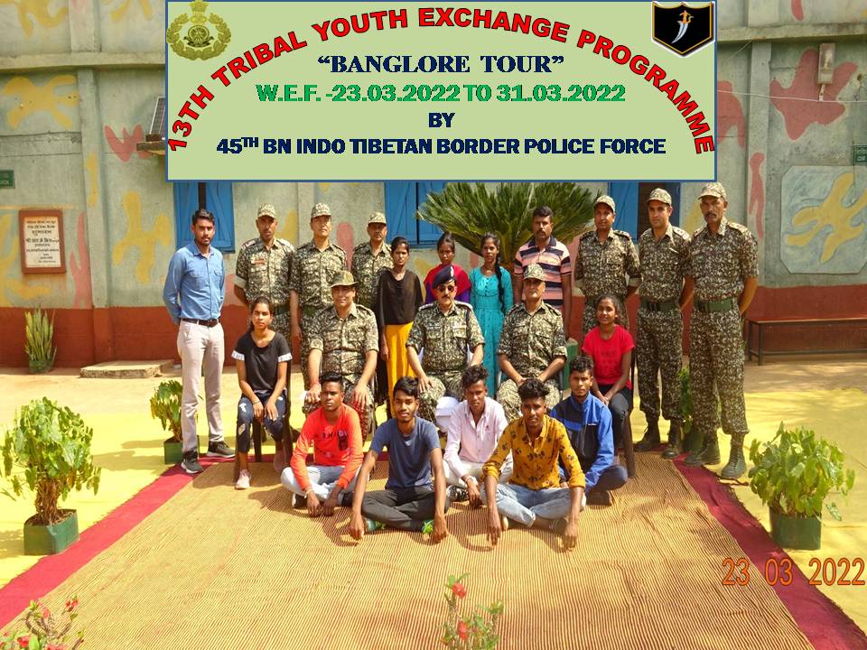 नारायणपुर-45वीं बटालियन, भारत तिब्बत सीमा पुलिस बल छत्तीसगढ़ के, नारायणपुर जिले में नक्सल विरोधी अभियान में तैनात है। नक्सल विरोधी दायित्वों के साथ साथ बटालियन अपने कार्यक्षेत्र में विभिन्न प्रकार के जनहित कार्यक्रम का आयोजन निरन्तर करवाती रहती है। इसी श्रृंखला में नेहरू युवा केन्द्र, खेल मंत्रालय भारत सरकार के सौजन्य एवं भारत तिब्बत सीमा पुलिस बल की अगुवाई में प्रत्येक वर्ष आयोजित करवाये जाने वाले आदिवासी युवा आदान-प्रदान कार्यक्रम के द्वितीय चरण के अन्तर्गत 31 मार्च तक आयोजित होने वाले बैगलुरु (कर्नाटक) भ्रमण हेतु जिला नारायणपुर में तैनात 45वीं बटालियन के कार्यक्षेत्र में रहने वाले दूर दराज के ग्रामों से कुल 10 छात्र-छात्राओं को चयनित कर बीते दिन सेनानी 45वी बटालियन भारत तिब्बत सीमा पुलिस बल श्री भानु प्रताप सिंह, द्वारा भेजा गया। उन्होंने भ्रमण के दौरान विभिन्न क्रिया कलापों में भाग लेने हेतु प्रोत्साहित किया और अवगत कराया गया कि इस भ्रमण का मुख्य उद्देश्य छत्तीसगढ़ के युवाओं को देश के एक प्रान्त से दूसरे प्रान्तों में भ्रमण करवा कर देश की विभिन्न संस्कृतियों, रीति रिवाजों एवं परम्पराओं से परिचित करवाना है जिससे राष्ट्र को एक सूत्र में पिरोया जा सके। सेनानी श्री सिंह ने सभी प्रतिभागियों को भ्रमण से पूर्व संबोधित किया गया तथा भ्रमण के दौरान स्वयं की सुरक्षा मौसम के अनुरूप स्वयं का बचाव इसके अलावा भ्रमण से सम्बन्धित कई महत्वपूर्ण जानकारियां दी गई। इसके अलावा युवाओं का आवाहन किया गया कि देश के चहुंमुखी विकास हेतु मुख्यधारा में शामिल होकर राष्ट्र के विकास में अपना महत्वपूर्ण योगदान दें। इस मौके पर श्री भानु प्रताप सिंह सेनानी के अतिरिक्त श्री मार्कण्डेय टाक, उप-सेनानी, डा. अखिलेश तोमर उप-सेनानी एवं वाहिनी के अन्य पदाधिकारी भी मौजूद रहे।