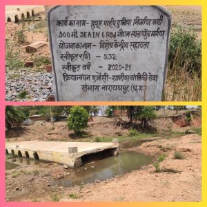 विभाग द्वारा ग्राम पंचायत में गौठान पहुँच मार्ग पर 2020-2021 वर्ष में 9.32लाख रुपये से एक पुलिया के निर्माण कराया गया परन्तु एप्रोच रोड बनाना मुनासिब नहीं समझा विभाग और निर्माण को अधूरा छोड़ शासकीय राशि का दुरुपयोग किया।