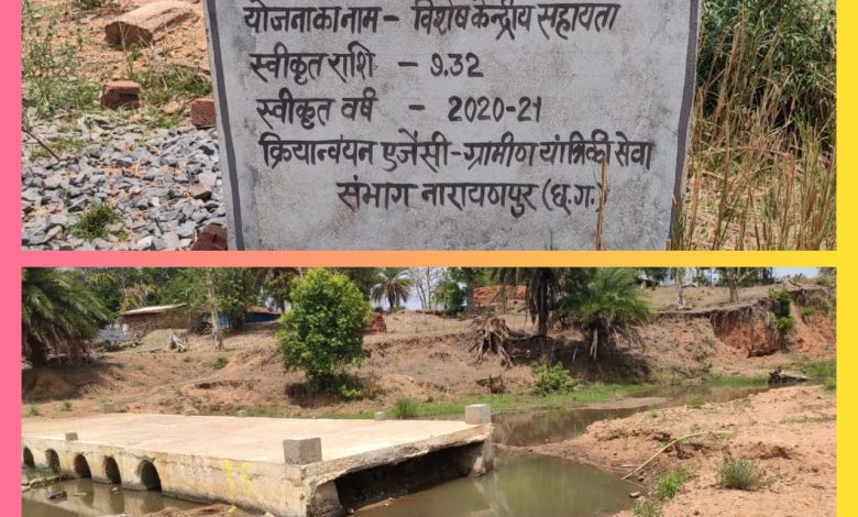 बता दें जिला मुख्यालय से महज 8 किमी दूर ग्राम पंचायत हलामीमुंजमेटा में राज्य सरकार की महत्वाकांक्षी योजना गौठान तक पहुँच मार्ग का निर्माण कराया गया। निर्माण एजेंसी ग्रामीण यांत्रिकी सेवा विभाग द्वारा विशेष केंद्रीय सहायता मद से 9.32 लाख रुपये से पुलिया निर्माण कराया गया जिसमें निर्माण एजेंसी द्वारा पुलिया निर्माण तो कराया गया परन्तु एप्रोच मार्ग नही बनवाया गया जिससे उस पुलिया का निर्माण उपयोगी साबित होता नजर नहीं आ रहा है और खुल कर शासकीय राशि का दुरूपयोग किया गया है।