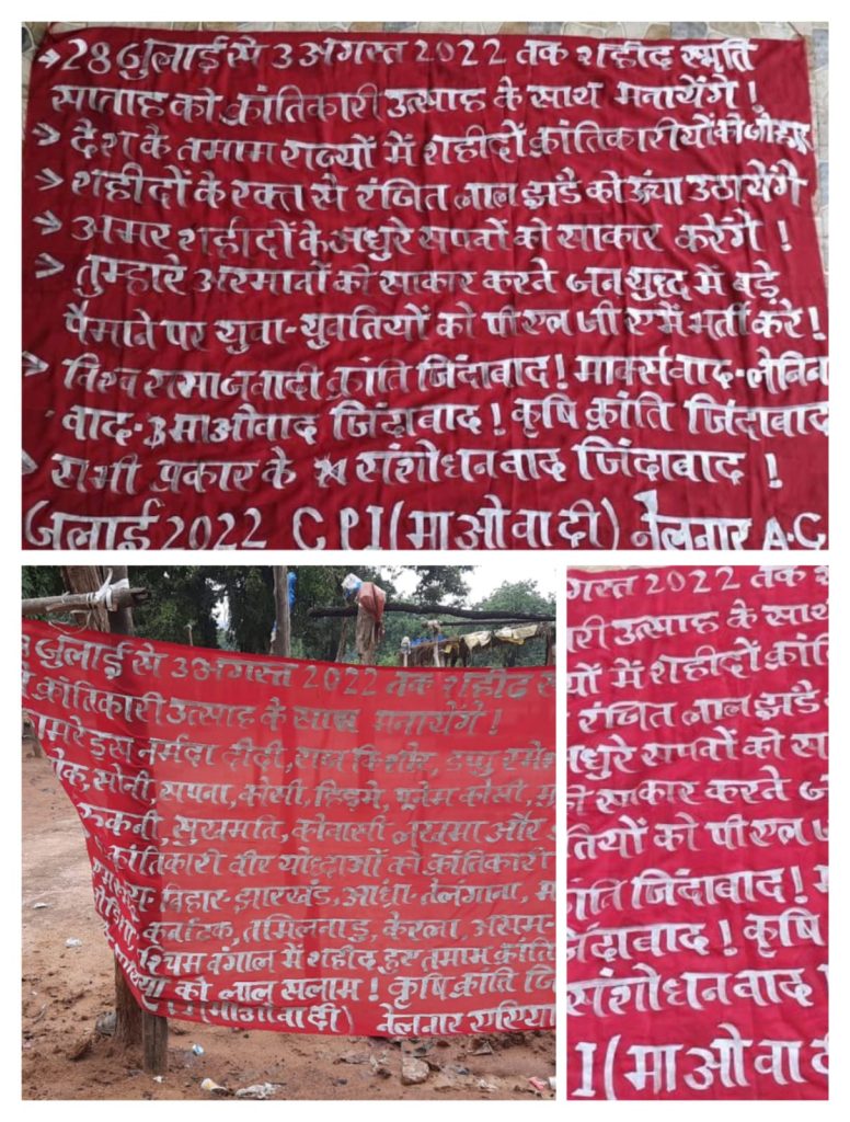 बैनर पोस्टर में मारे गए नक्सली कमांडर नर्मदा, राजकिशोर,हिडमा,कोवासी लखमा,कोसी आदि की याद में 28 जुलाई से 03 अगस्त के मध्य शहिद सप्ताह मनाने का एलान किया है।