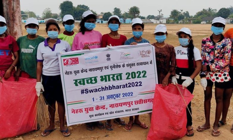 नारायणपुर 09 नवंबर 2022- जिले में स्वच्छता को बढ़ावा देने के उद्देश्य से जिला मुख्यालय नारायणपुर के निकट ग्राम पंचायतों में नेहरू युवा केंद्र संगठन एवं यूनिसेफ छत्तीसगढ़ के तत्वाधान में स्वच्छ भारत 2.0 कार्यक्रम का आयोजन किया गया। इसके तहत् नारायणपुर ब्लाक के ’वॉलिंटियर अपने फोकस 5 ग्राम पंचायतों में स्वच्छता अभियान के तहत खेल मैदान, सार्वजनिक पेयजल स्थल, स्कूल, आंगनबाड़ी, उप स्वास्थ्य केंद्र एवं आसपास के स्थलों में साफ-सफाई की गई। इस कार्यक्रम के तहत लोगों को कैंप आयोजित कर साफ सफाई के संबंध में जागरूक किया गया। इस कार्यक्रम में वलिंटियर्स के द्वारा हैंड ग्लब्स, मास्क, सैनिटाइजर, कैप इत्यादि प्रदान किया गया।