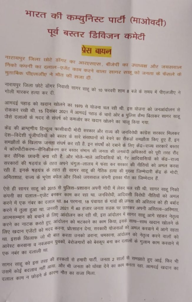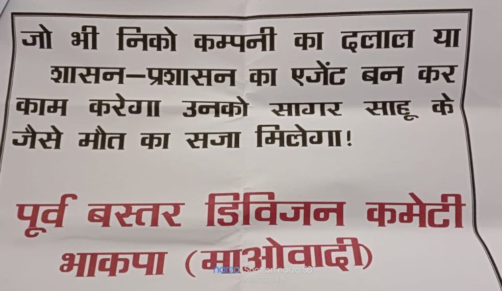 सागर साहू को इस तरह की हरकतों से हमारी पार्टी, जनता 2 सालों से समझाते हुए आई, फिर भी उसमें कोई बदलाव नहीं आया. और भी जनता को धोखा देने का काम करता रहा. आमदई खदान का दलाल काम न छोड़ने के कारण मौत का सजा मिला. तबका के लोगों, सामाजिक संगठनों, बुद्धिजीवियों, छात्र-नवजवानों, महिलाओं, कर्मचारियों, दी प्रगतिशील संगठनों, देशमतों से पूर्व बस्तर डिविजन कमेटी अपील करती है कि आमदई को बचाने, जल-जंगल-जमीन को बचाने आंदोलन में आगे आयें. निको कंपनी के दलालों को नगाओ, निको कंपनी के दलाल काम करने वाले बैदराज, कोमलमांझी, हरीमांझी इन लोग जनता मने आ कर अपना गलती मानें गलती न मानने वालों को सामाजिक बहिष्कार करें. ईखदान को रद्द करने के लिए हर तबके की जनता जुझारू संघर्ष करने आगे आयें.
