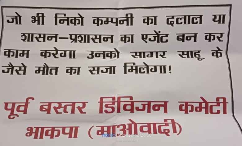 जो भी निकों कंपनी का दलाल या शासन प्रशासन का एजेंट बन कर काम करेगा उसको सागर साहू के जैसे मौत का सजा मिलेगा – माओवादी संगठन प्रवक्ता : नीति ने फरमान जारी किया है।.. जाने नारायणपुर एसपी पुष्कर शर्मा ने क्या कहा हैं।